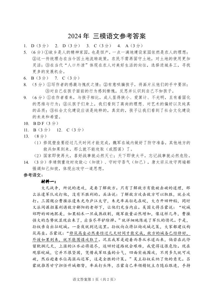 吉林省长春市2024届高三下学期第三次质量监测(长春三模)语文答案