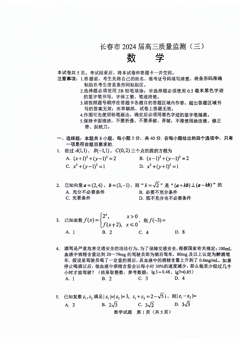 吉林省长春市2024届高三下学期第三次质量监测(长春三模)数学