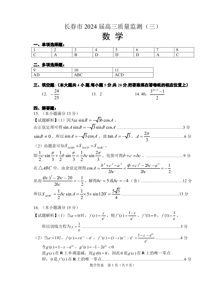 吉林省长春市2024届高三下学期第三次质量监测(长春三模)数学答案