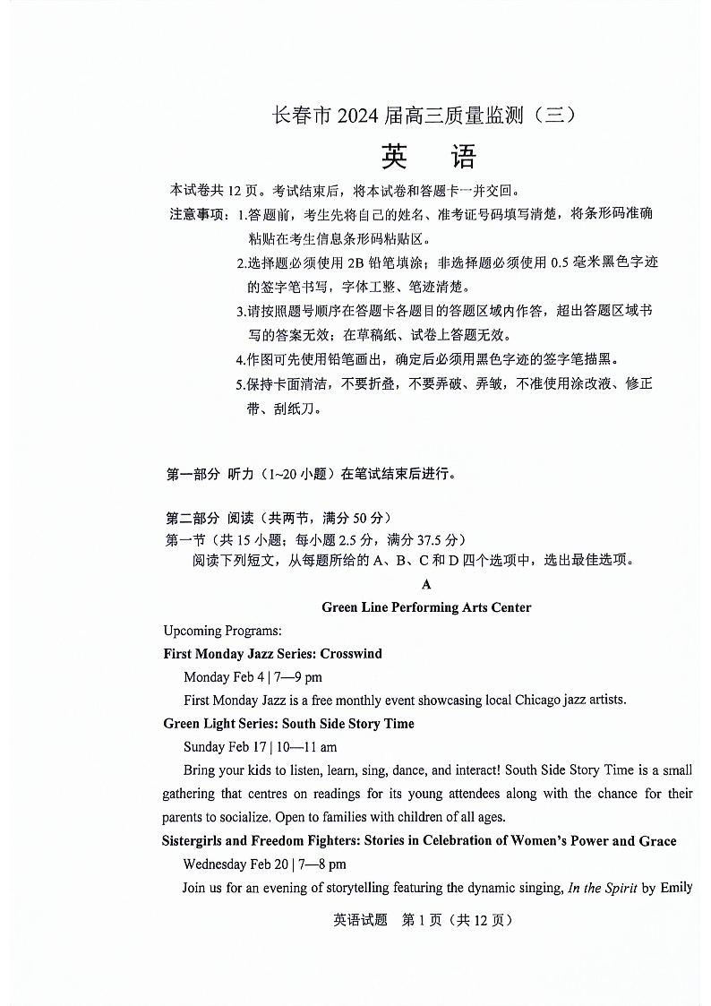 吉林省长春市2024届高三下学期第三次质量监测(长春三模)英语