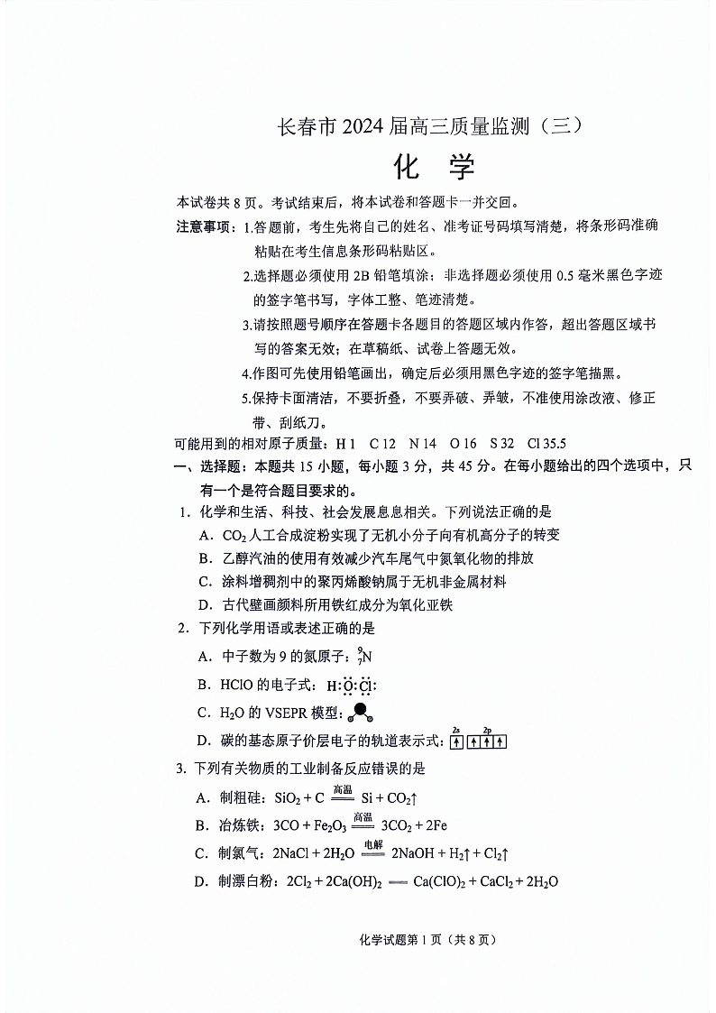 吉林省长春市2024届高三下学期第三次质量监测(长春三模)化学