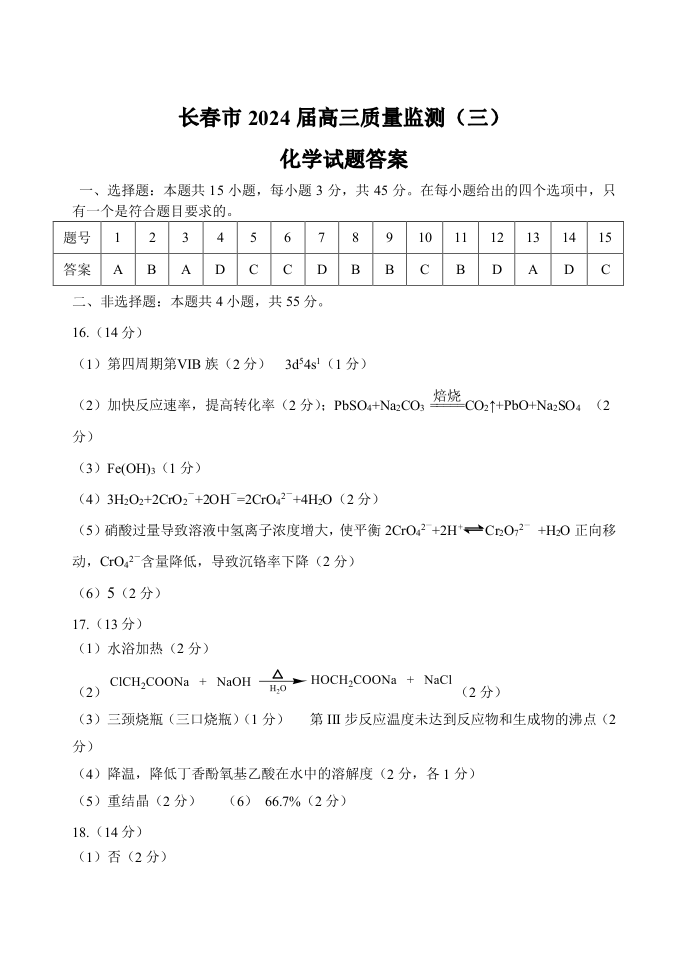 吉林省长春市2024届高三下学期第三次质量监测(长春三模)化学答案