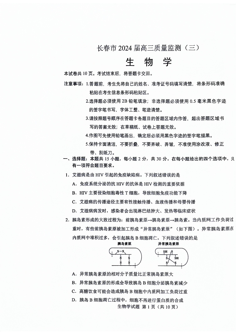 吉林省长春市2024届高三下学期第三次质量监测(长春三模)生物