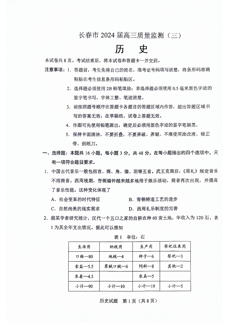 吉林省长春市2024届高三下学期第三次质量监测(长春三模)历史
