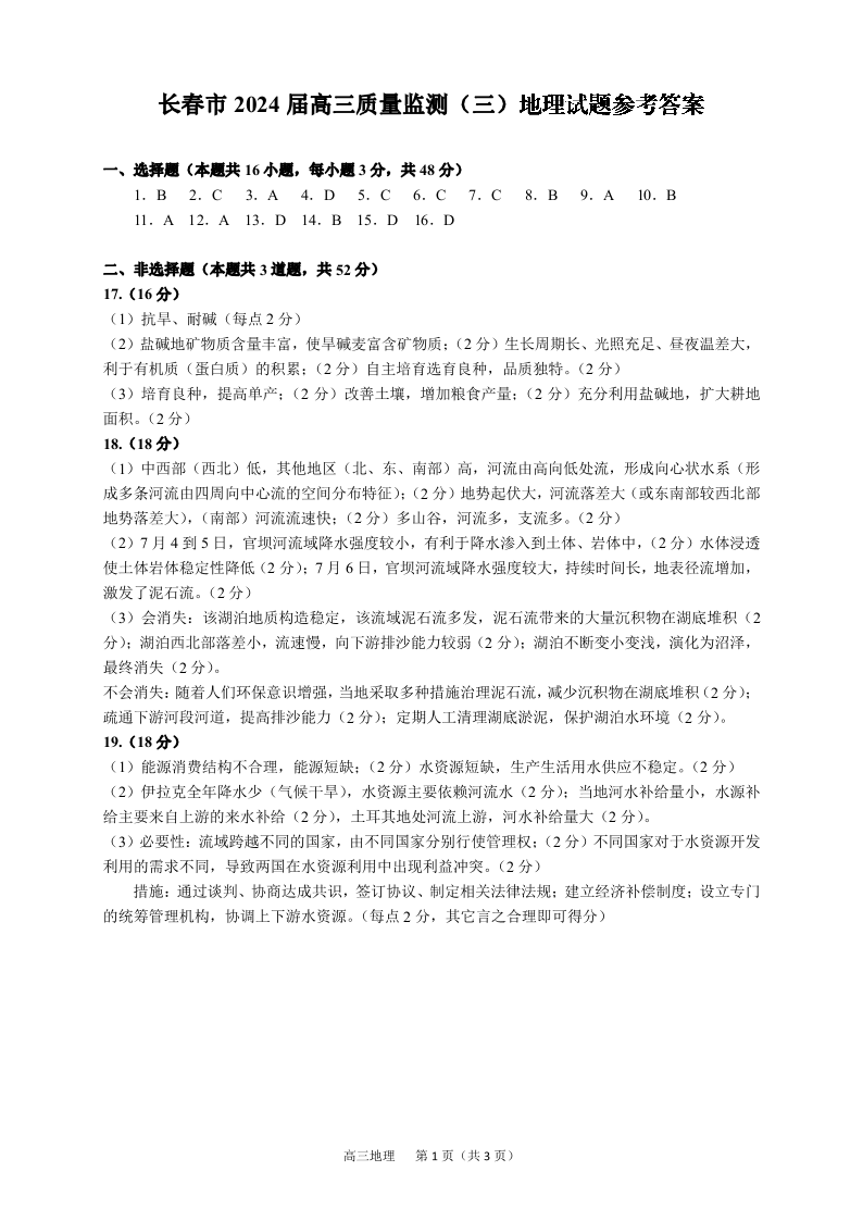 吉林省长春市2024届高三下学期第三次质量监测(长春三模)地理答案