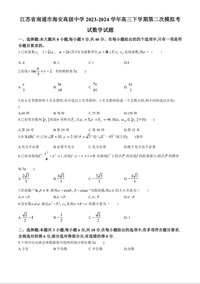 江苏省南通市2024届海安高级中学高三下学期第二次模拟考试数学+答案