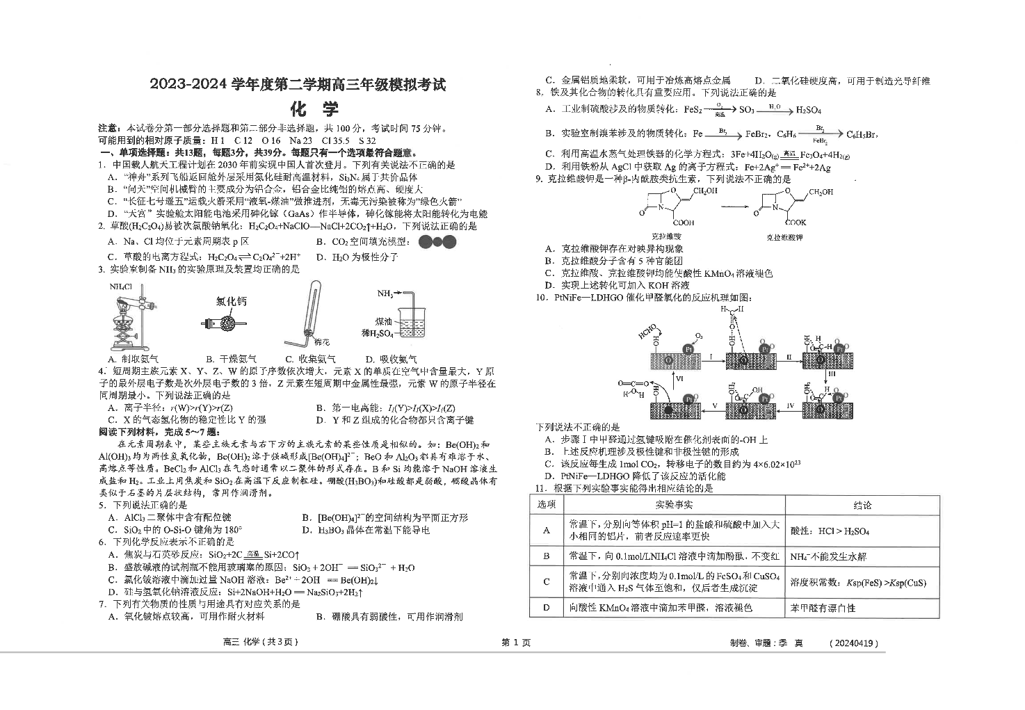 江苏省南通市2024届海安高级中学高三下学期第二次模拟考试化学+答案