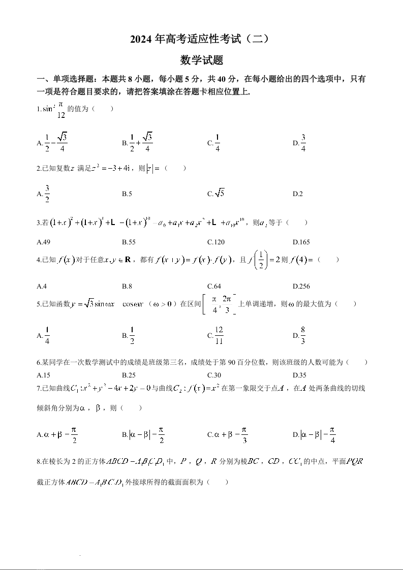 江苏省南通市如皋市2024届高三下学期适应性考试(二)(南通2.5模)数学