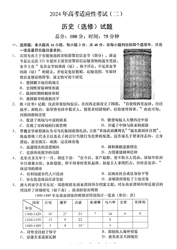江苏省南通市如皋市2024届高三下学期适应性考试(二)(南通2.5模)历史+答案