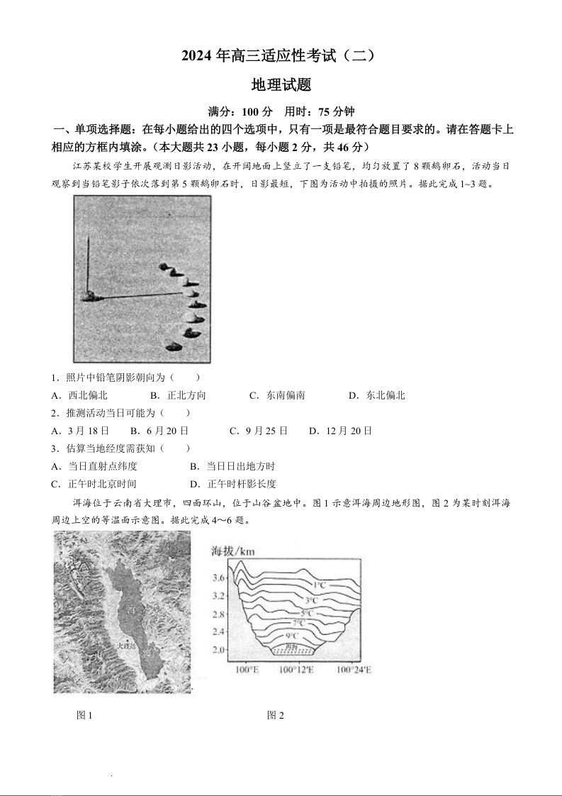 江苏省南通市如皋市2024届高三下学期适应性考试(二)(南通2.5模)地理+答案