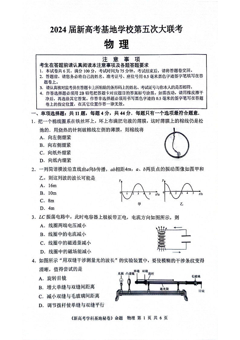 江苏新高考基地学校2024届高三下学期第五次大联考物理