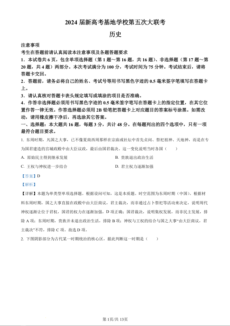 江苏新高考基地学校2024届高三下学期第五次大联考历史(精品解析版)