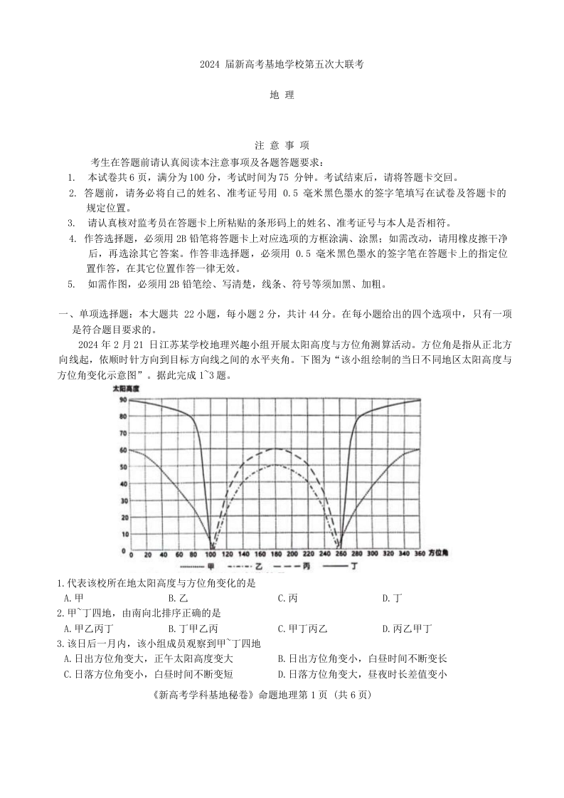 江苏新高考基地学校2024届高三下学期第五次大联考地理