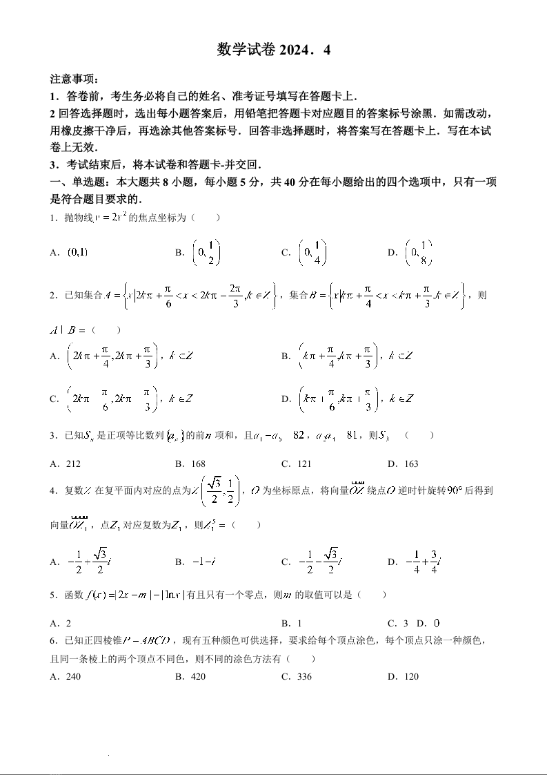 江西省八所重点中学2024届高三下学期4月联考数学+答案