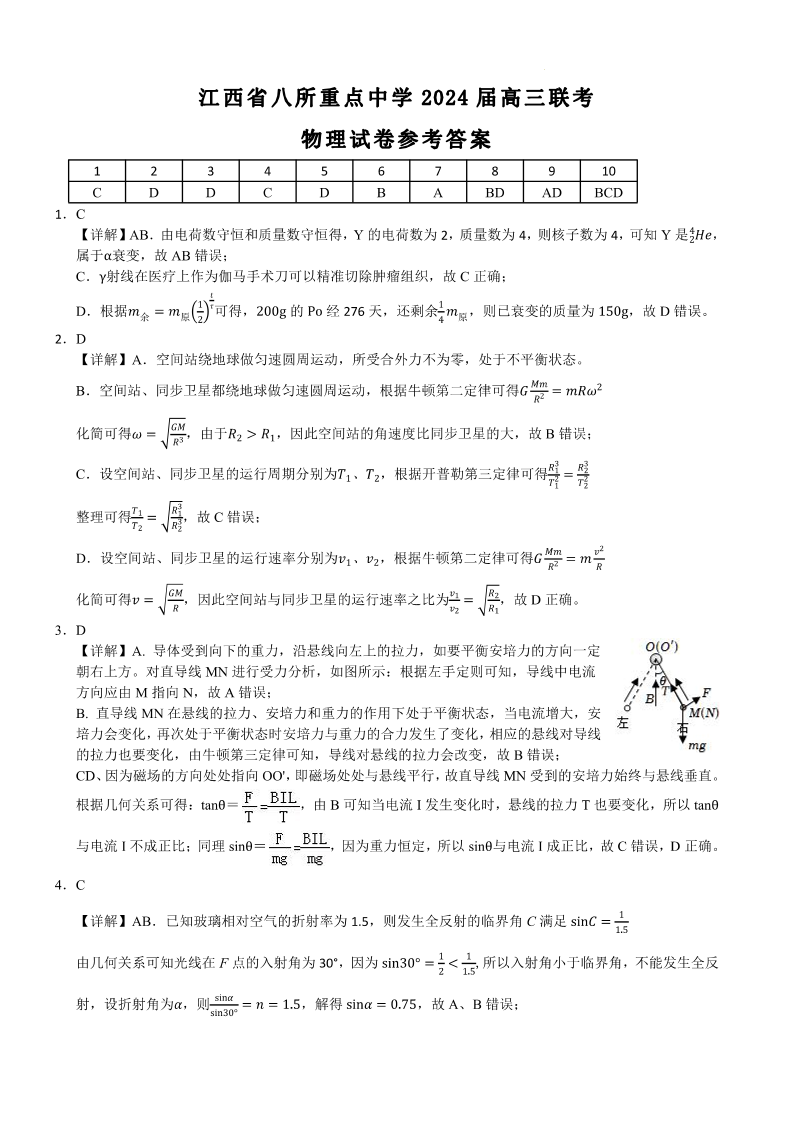 江西省八所重点中学2024届高三下学期4月联考物理答案
