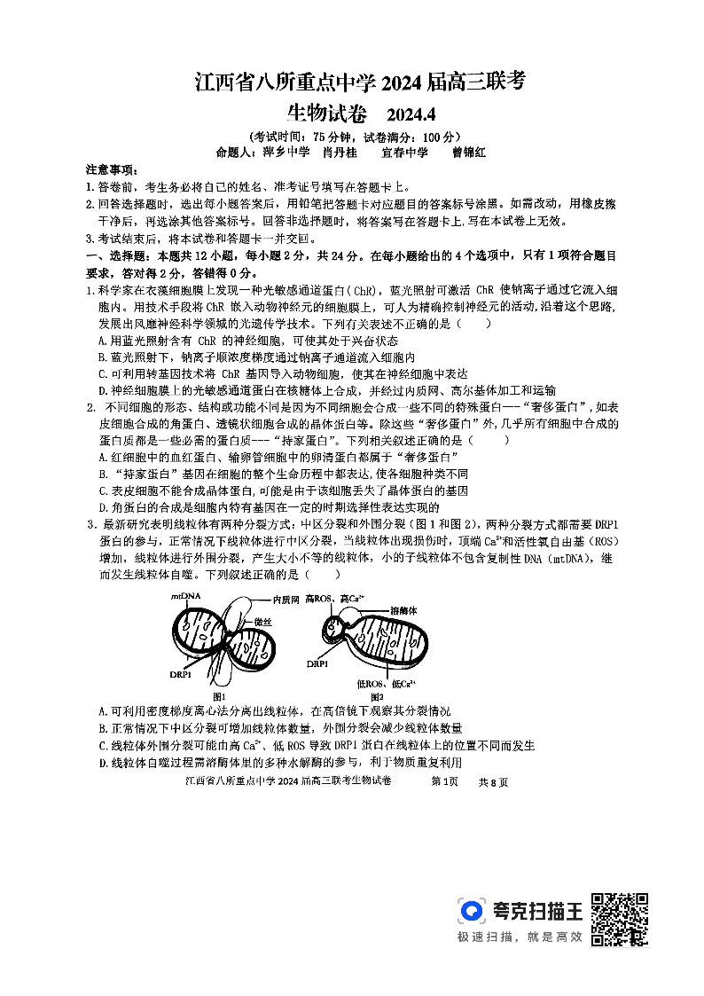 江西省八所重点中学2024届高三下学期4月联考生物