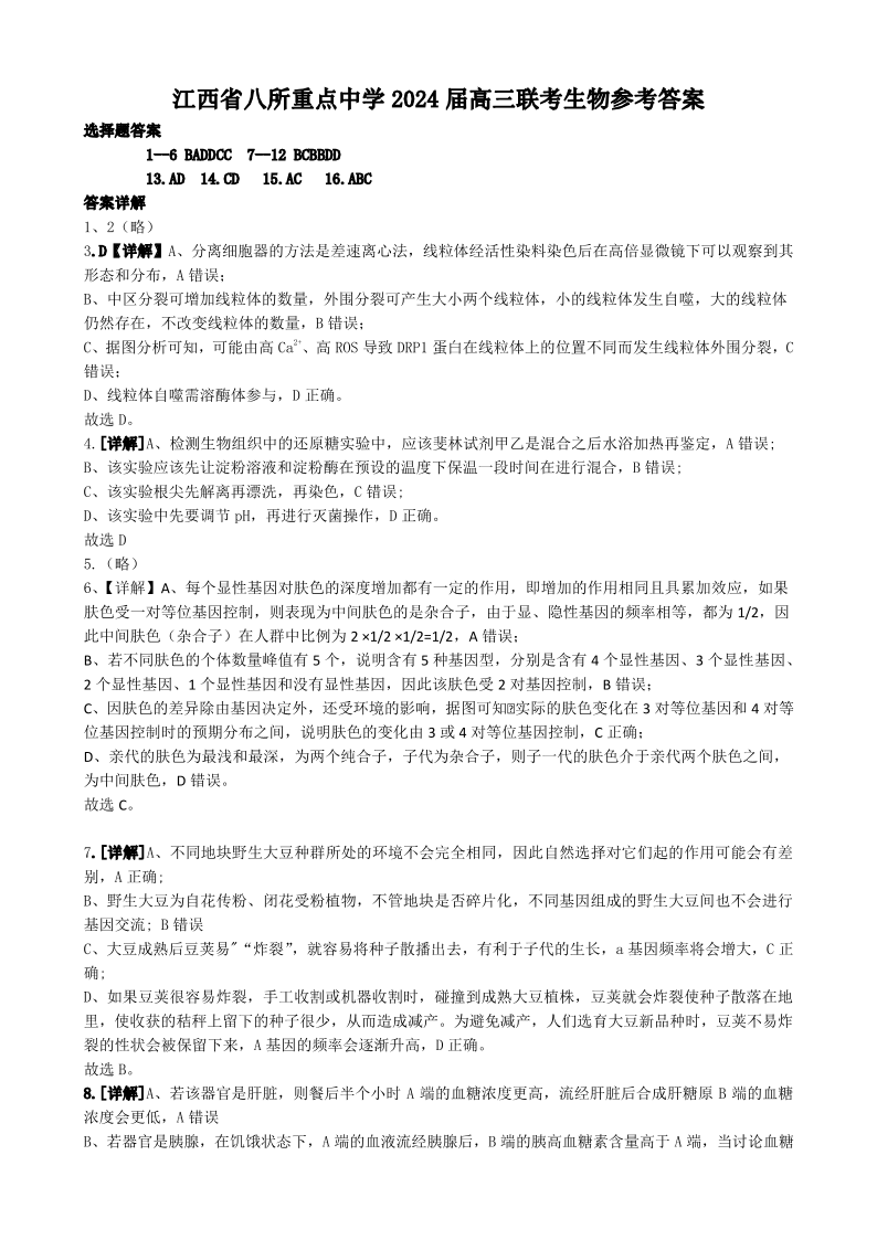 江西省八所重点中学2024届高三下学期4月联考生物答案