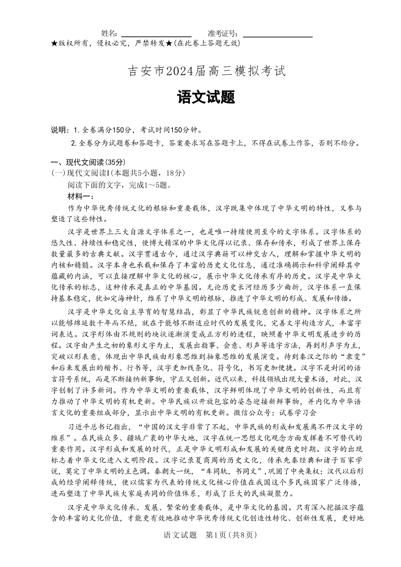 江西省恩博2024年高三4月联考(赣抚吉)语文