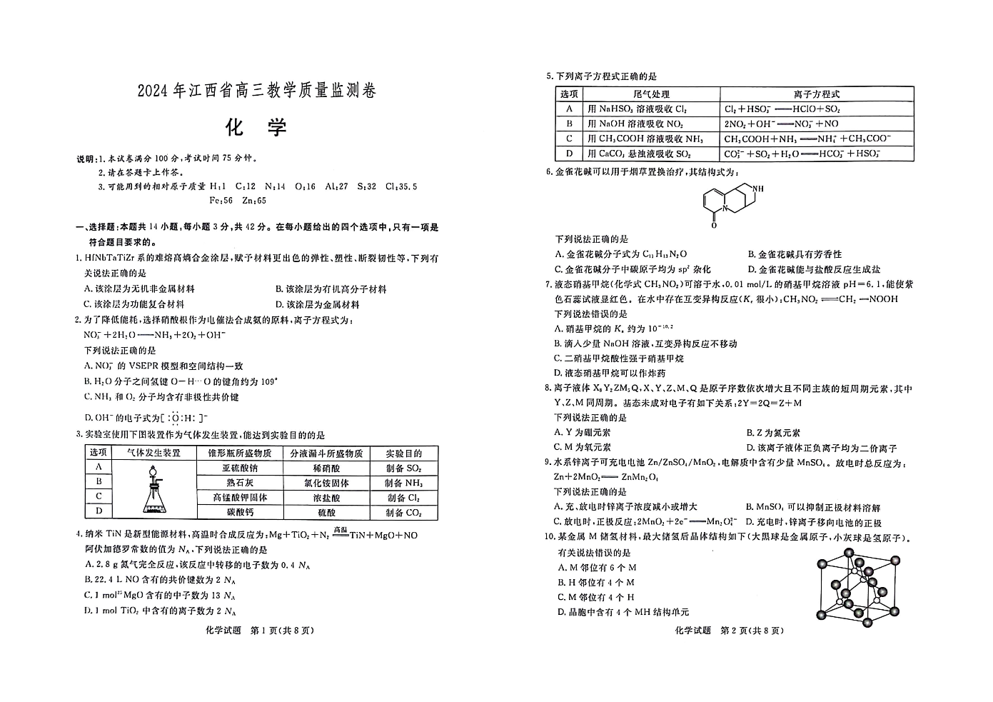 江西省恩博2024年高三4月联考(赣抚吉)化学