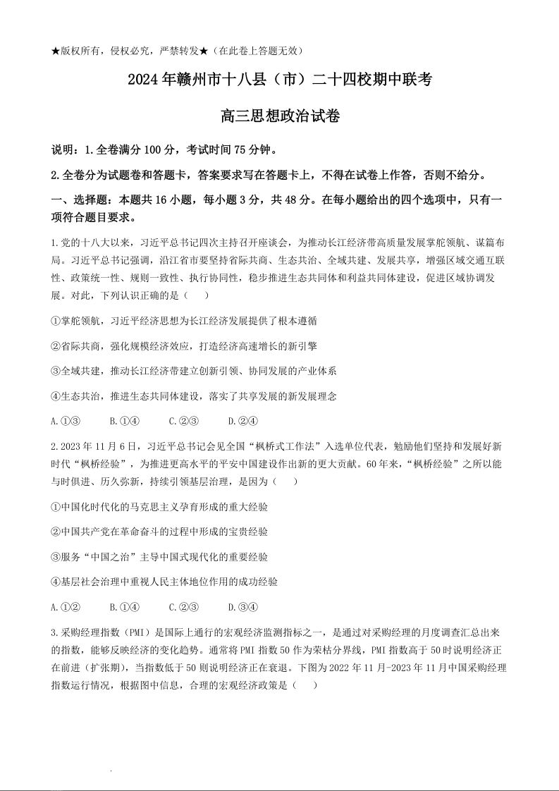 江西省恩博2024年高三4月联考(赣抚吉)政治