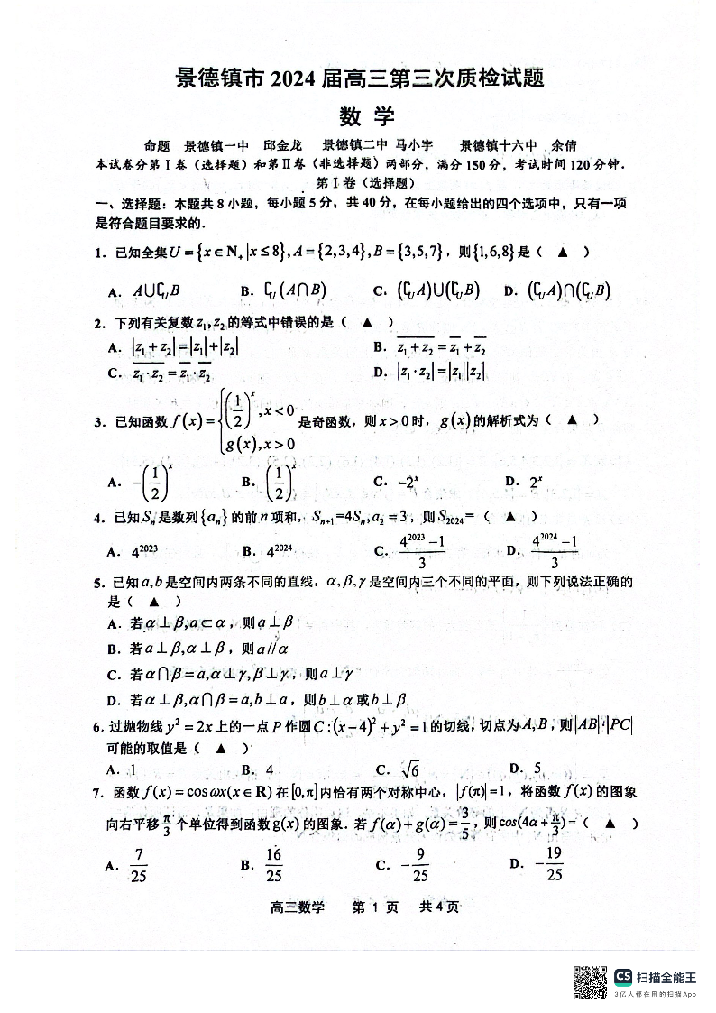 江西省景德镇市2024届高三第三次质量检测(景德镇三模)数学