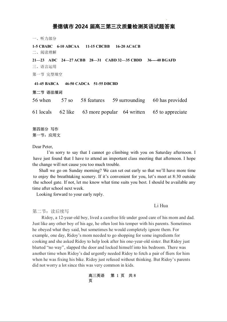 江西省景德镇市2024届高三第三次质量检测(景德镇三模)英语答案