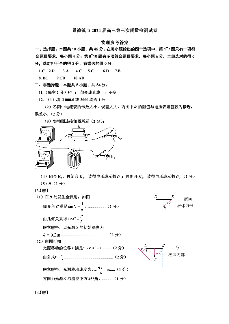 江西省景德镇市2024届高三第三次质量检测(景德镇三模)物理答案