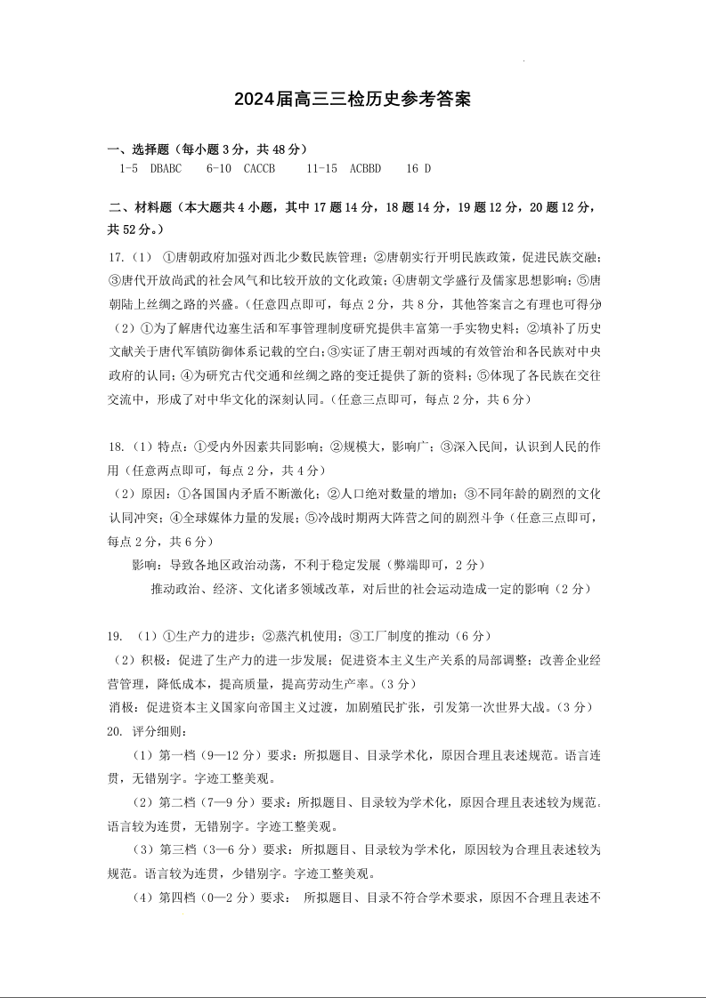 江西省景德镇市2024届高三第三次质量检测(景德镇三模)历史答案