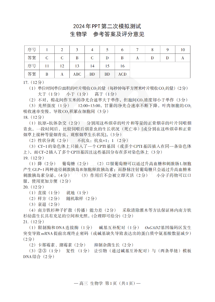 江西省南昌市2024届高三下学期二模考试(南昌二模)生物答案