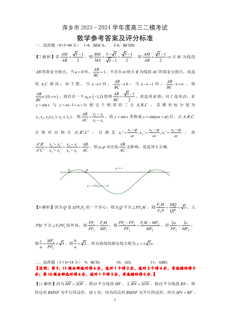江西省萍乡市2024届高三下学期二模考试数学答案