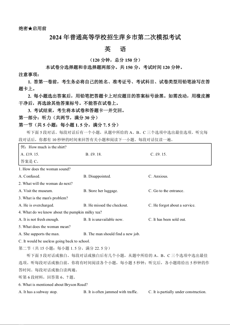 江西省萍乡市2024届高三下学期二模考试英语+答案