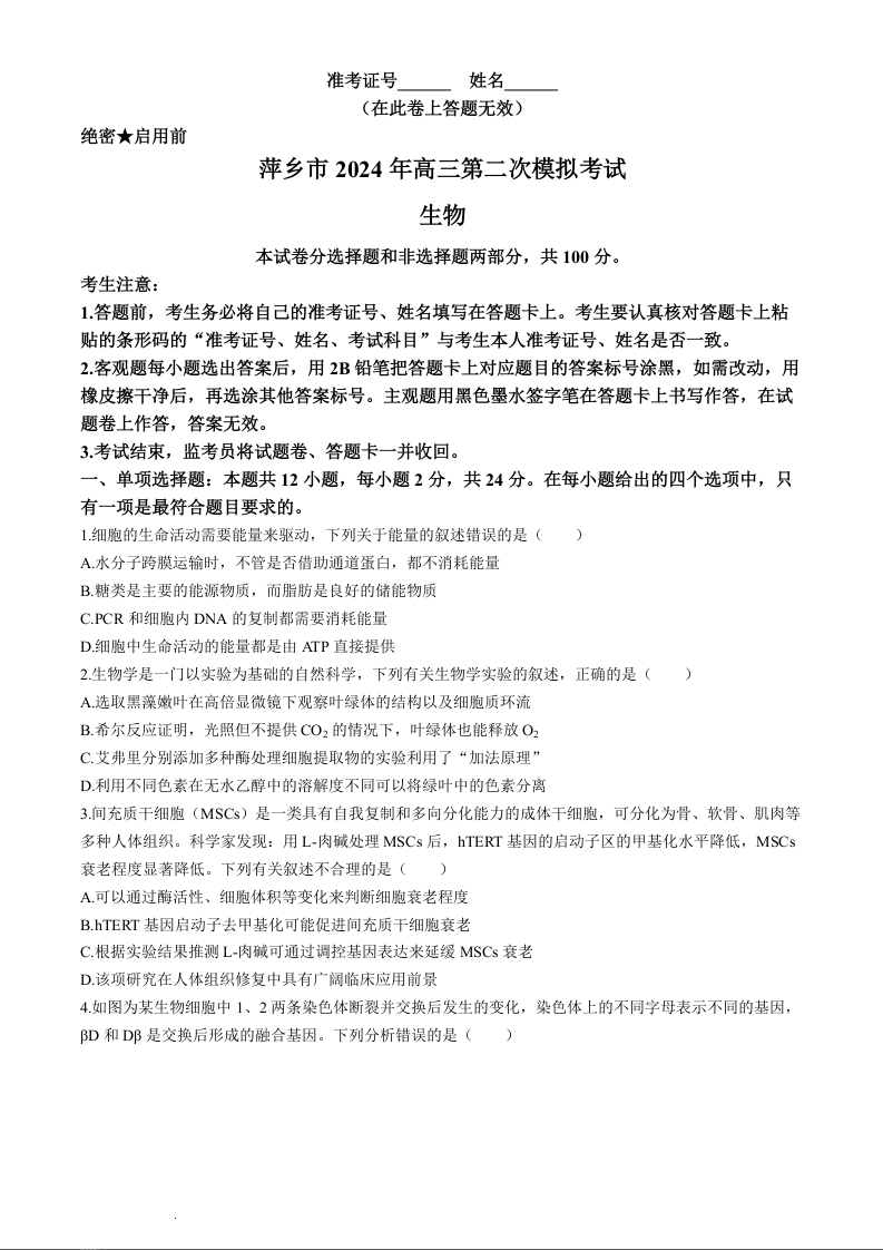 江西省萍乡市2024届高三下学期二模考试生物+答案