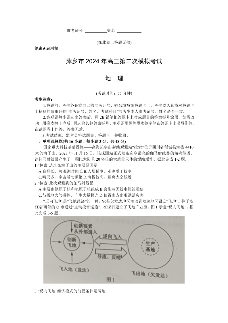 江西省萍乡市2024届高三下学期二模考试地理