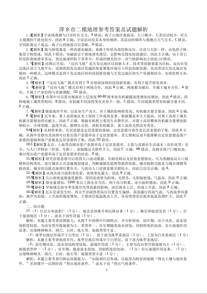 江西省萍乡市2024届高三下学期二模考试地理答案