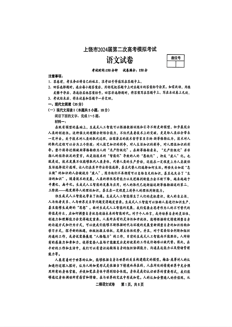 江西省上饶市2024届高三下学期第二次模拟考试(上饶二模)语文+答案