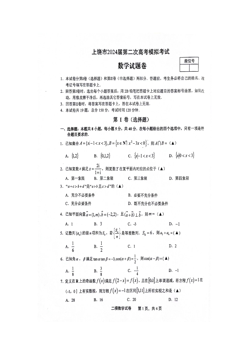 江西省上饶市2024届高三下学期第二次模拟考试(上饶二模)数学+答案