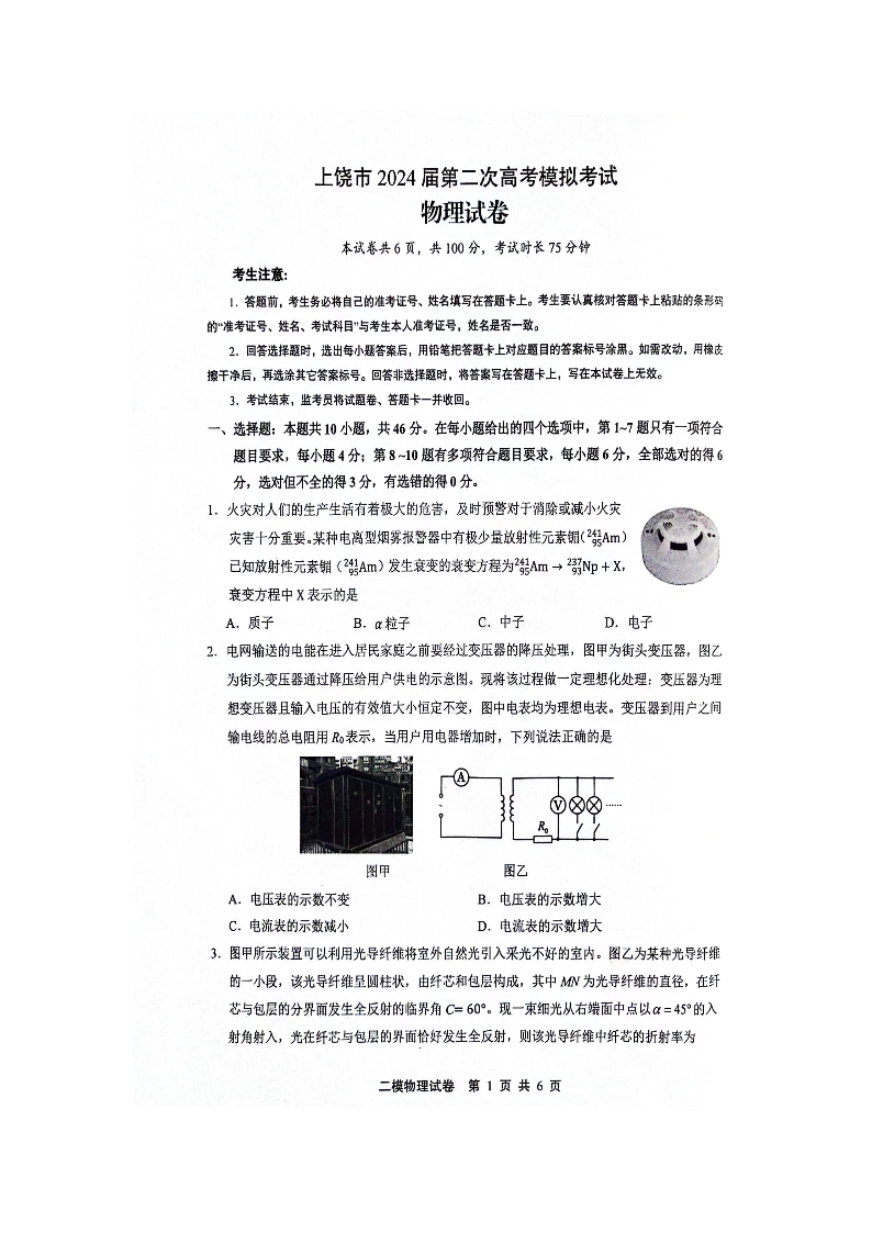 江西省上饶市2024届高三下学期第二次模拟考试(上饶二模)物理+答案