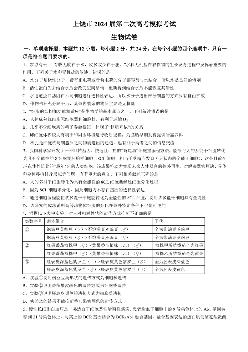 江西省上饶市2024届高三下学期第二次模拟考试(上饶二模)生物