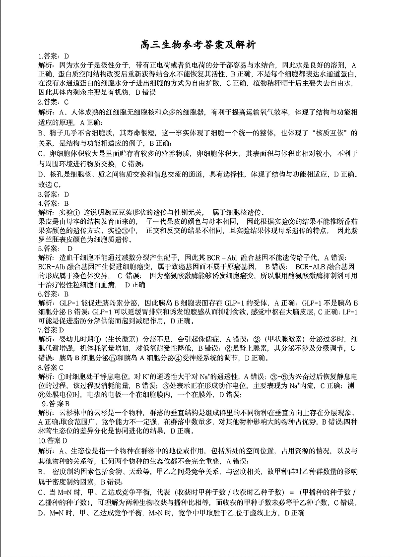 江西省上饶市2024届高三下学期第二次模拟考试(上饶二模)生物答案
