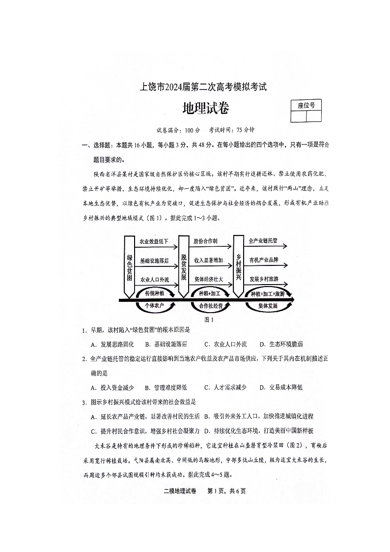 江西省上饶市2024届高三下学期第二次模拟考试(上饶二模)地理+答案