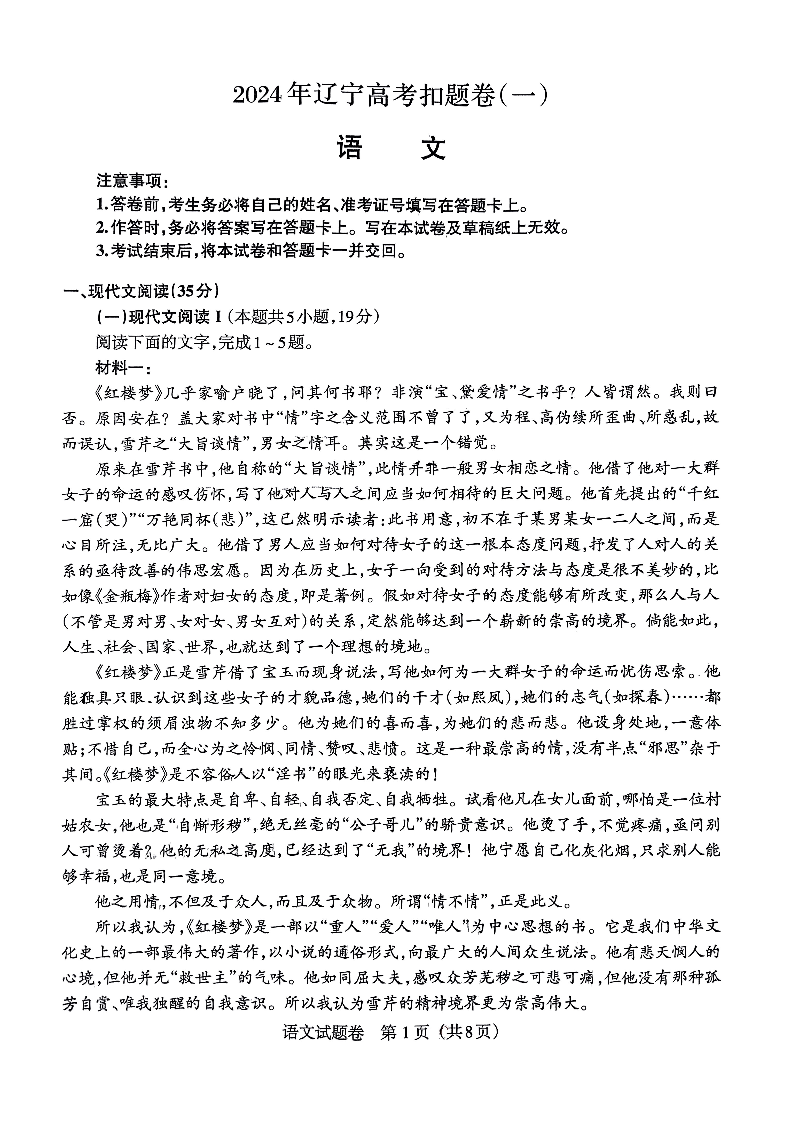 辽宁省2024届高三下学期高考扣题(一)语文