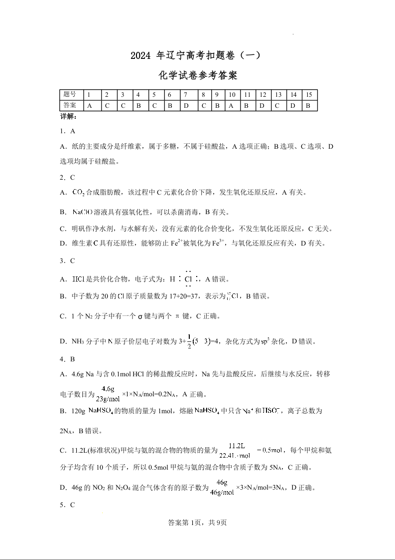 辽宁省2024届高三下学期高考扣题(一)化学答案