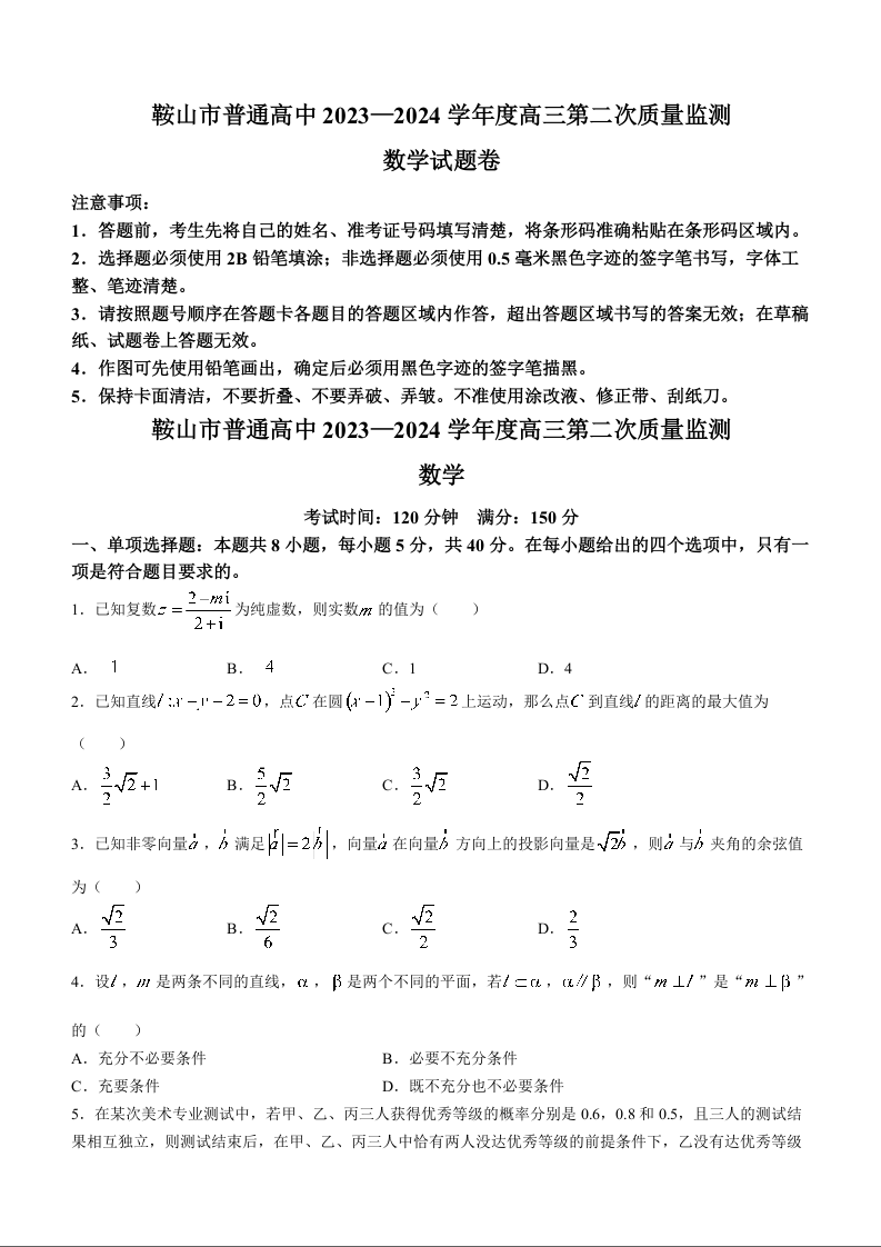 辽宁省鞍山市普通高中2024届高三下学期第二次质量监测数学