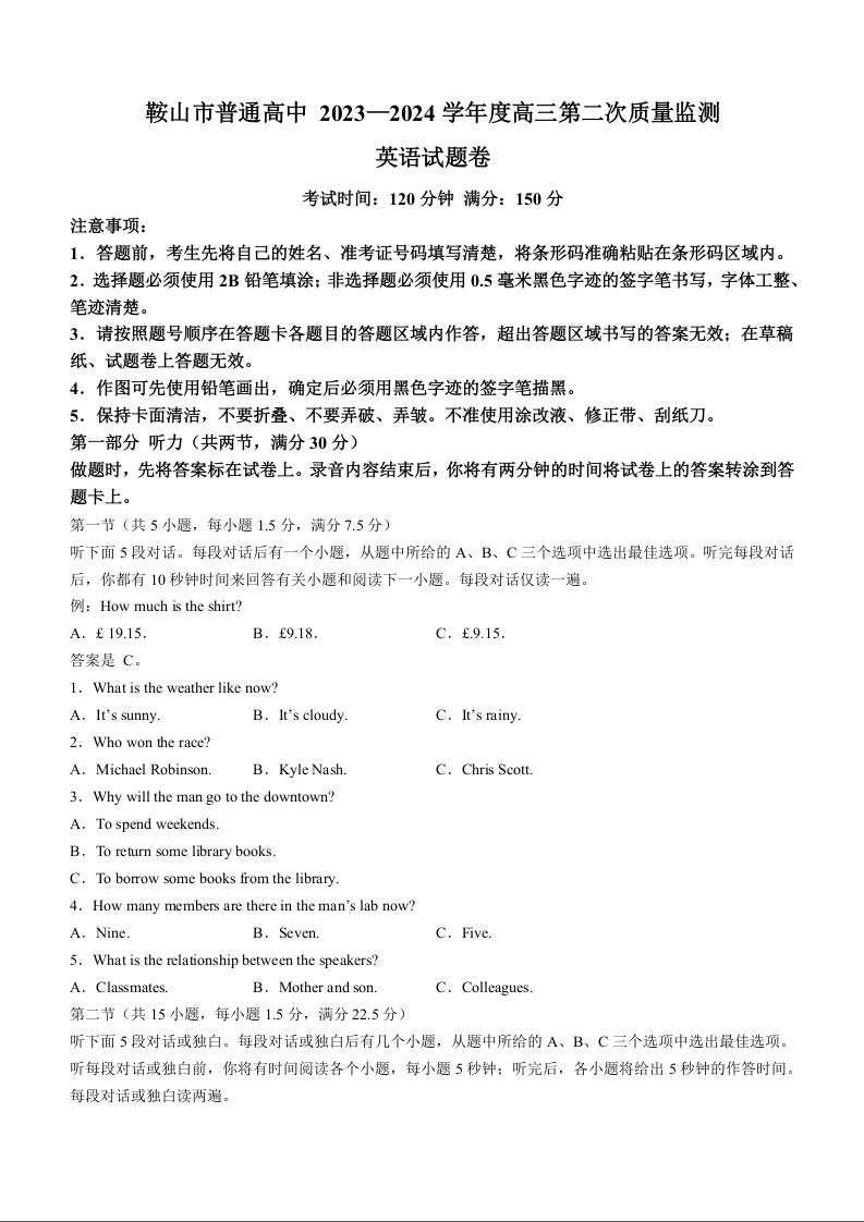 辽宁省鞍山市普通高中2024届高三下学期第二次质量监测英语+答案