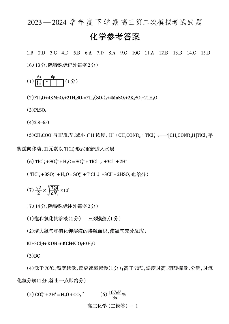 辽宁省重点高中协作校2023 - 2024学年度下学期高三第二次模拟考试化学答案