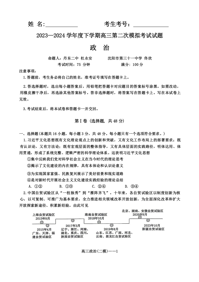 辽宁省重点高中协作校2023 - 2024学年度下学期高三第二次模拟考试政治