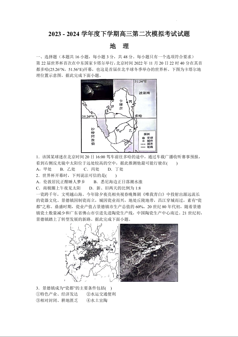 辽宁省重点高中协作校2023 - 2024学年度下学期高三第二次模拟考试地理+答案