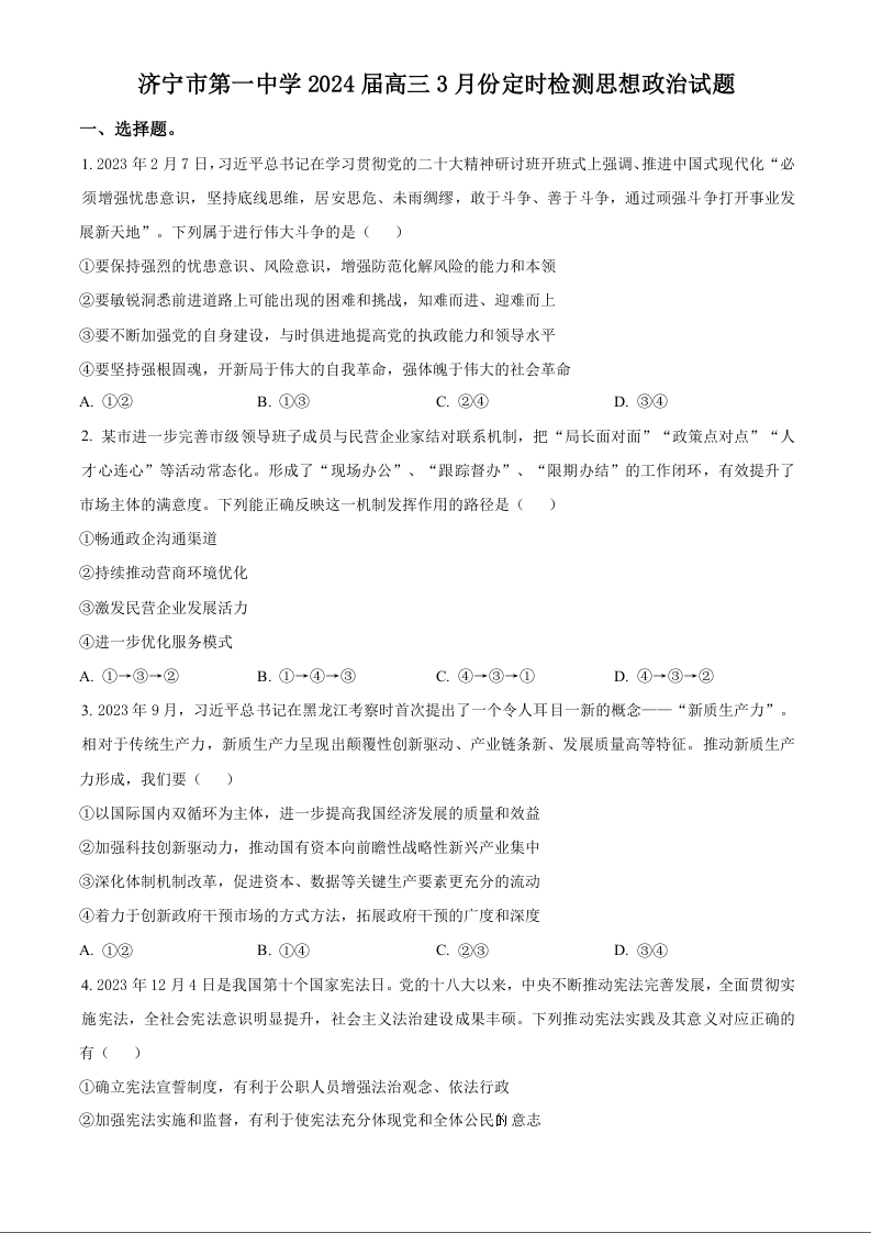 山东省济宁市第一中学2024届高三下学期3月月考政治+答案