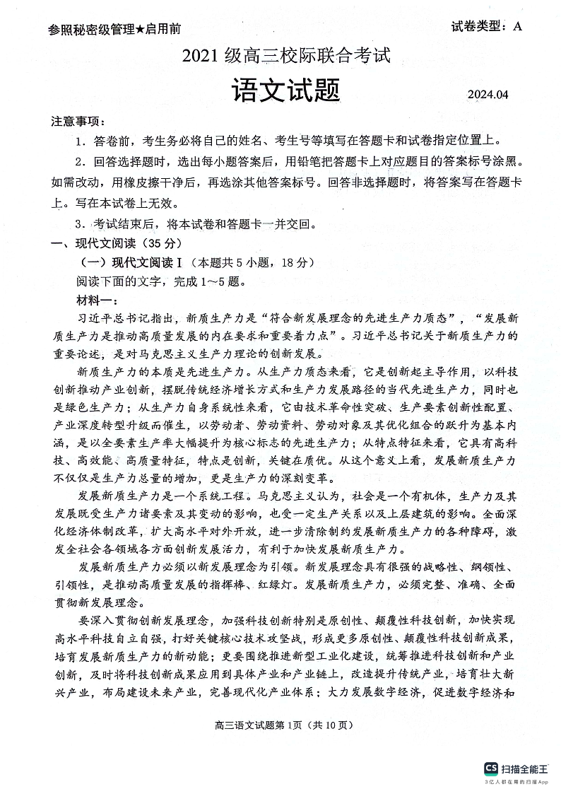 山东省日照市2024届高三下学期4月校际联合考试(日照二模)语文