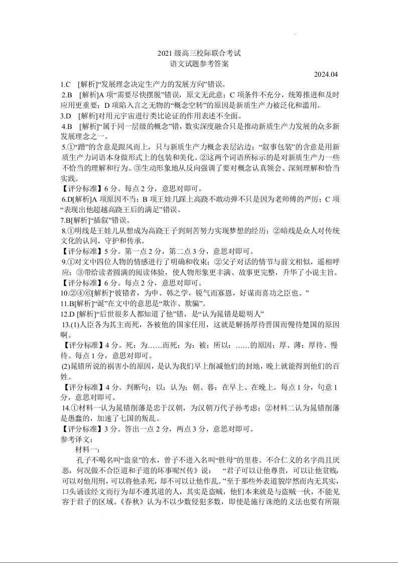 山东省日照市2024届高三下学期4月校际联合考试(日照二模)语文答案